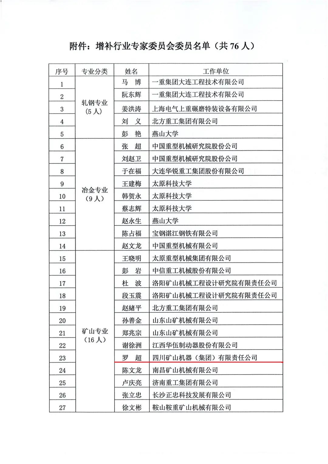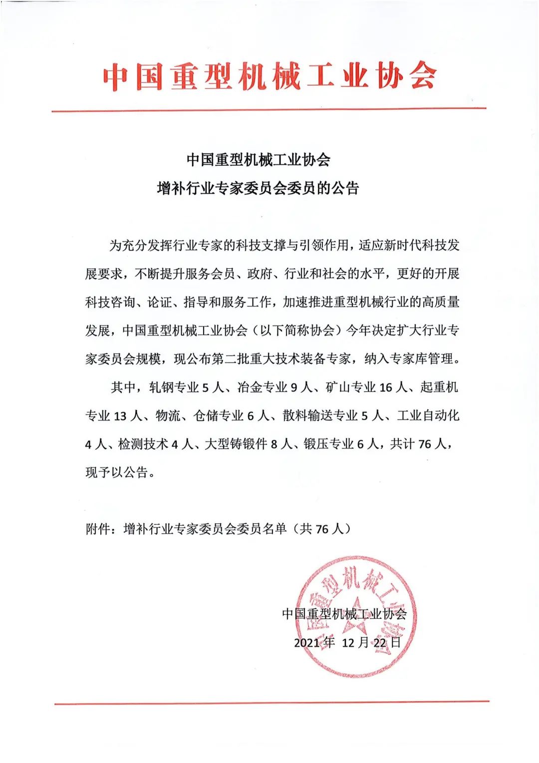 中國重型機(jī)械工業(yè)協(xié)會增補(bǔ)行業(yè)專家委員會委員的公告