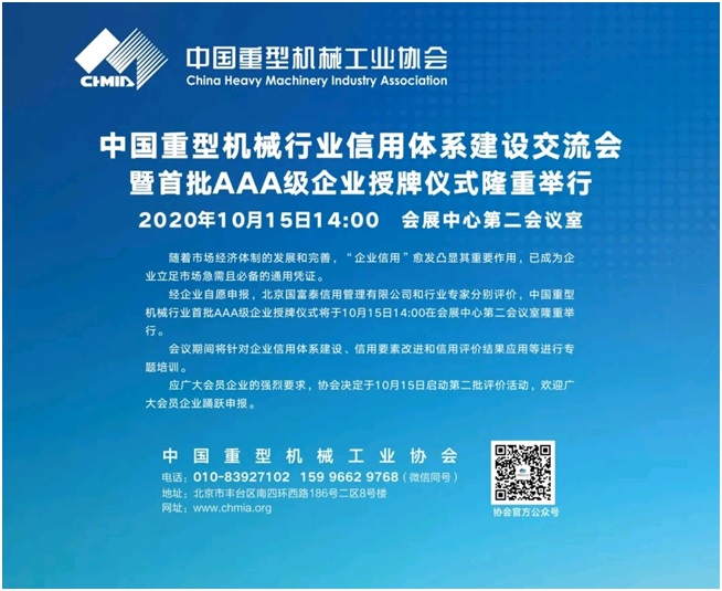 為深入貫徹落實國務院《社會信用體系建設規(guī)劃綱要(2014-2020)》,著力推動中國重型機械行業(yè)信用體系建設,規(guī)范行業(yè)市場秩序,增強企業(yè)信用意識,促進行業(yè)持續(xù)和諧健康發(fā)展,由中國重型機械工業(yè)協(xié)會開展的首批中國重型機械行業(yè)企業(yè)信用等級評價工作,經(jīng)行業(yè)專家評審會嚴格評審于日前揭曉,包括川礦集團在內(nèi)的共計49家企業(yè)榮膺“中國重型機械行業(yè)首批AAA級信用等級企業(yè)”,近日將進行隆重的授牌儀式。